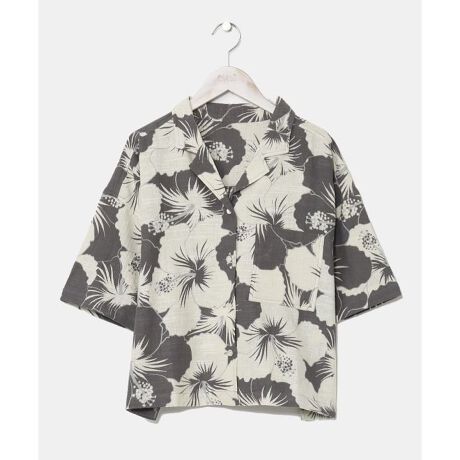 [型番:4ID-5217-2025]ざっくりとした風合いの綿素材の生地に、レトロ感のあるプリントが華やかなショート丈のアロハシャツ。ボタンを開けて羽織りとしても活躍します。
