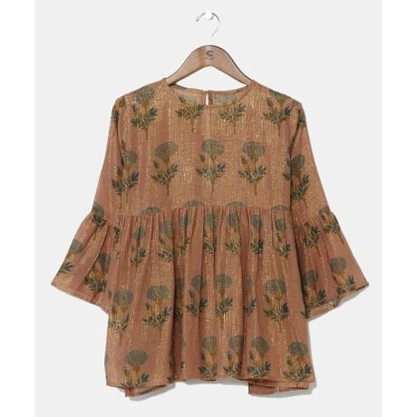 [型番:IPF-5206-2025]動くたびに輝く金糸が織り込まれた透け感のあるトップス。軽く、ふんわりとした素材感が魅力。インドの伝統技法「ブロックプリント」をイメージしたの花柄をプリント。