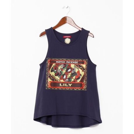[型番:CCP-5202-2025]大人気のマッチ香シリーズに新たに登場したレディースのタンクトップ。ヴィンテージ感溢れる個性的な柄のマッチ香プリントと背中の刺しゅうがポイント。裾に向かって広がるフィッシュテールデザインが軽やかさを演出。シャツやトップスとの重ね着でも大活躍間違いなしのアイテム。
