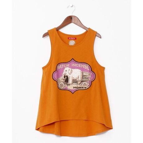 [型番:CCP-5202-2025]大人気のマッチ香シリーズに新たに登場したレディースのタンクトップ。ヴィンテージ感溢れる個性的な柄のマッチ香プリントと背中の刺しゅうがポイント。裾に向かって広がるフィッシュテールデザインが軽やかさを演出。シャツやトップスとの重ね着でも大活躍間違いなしのアイテム。