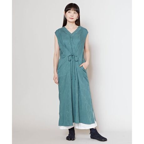 菊の花が繊細に浮かび上がるノースリーブワンピース。着物のような衿デザインが和の趣を感じさせつつ、ノースリーブ仕様で軽やかに着こなせます。肌触りの良いレーヨン素材で心地よく、さらりとした着心地が魅力。羽織りとの合わせアイテムとしても重宝できる一枚です。