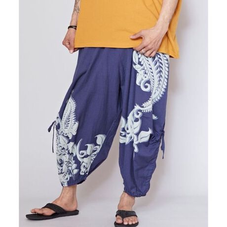 [型番:IDS-5234-2025]大胆なペイズリー柄をプリントしたサルエルパンツ。裾を絞ると形を変えられるので、様々なコーディネートを楽しめる。