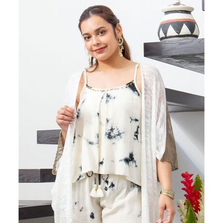 [型番:IAT-5209-2025]インドのタイダイ柄が映えるキャミソール。肩紐は調節可能で、胸元にはインド舞踊「カタックダンス」で足につける鈴「グングル」がアクセントとしてあしらわれている。個性的な変形デザインが、動きにあわせて揺れるシルエットを楽しませてくれる。