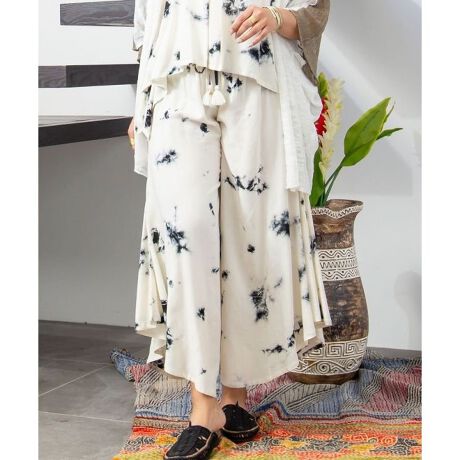 [型番:IAT-5212-2025]インドのタイダイ柄が映えるパンツ。薄手でさらっとしたレーヨン素材。サイドが短くなっているので、動くたび揺れる「踊り子」のようなシルエットを楽しめる。ウエストの紐には、インド舞踊「カタックダンス」で足につける「グングル」と呼ばれる鈴が付いており、コーディネートのアクセントに。
