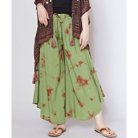 [型番:IAT-5212-2025]インドのタイダイ柄が映えるパンツ。薄手でさらっとしたレーヨン素材。サイドが短くなっているので、動くたび揺れる「踊り子」のようなシルエットを楽しめる。ウエストの紐には、インド舞踊「カタックダンス」で足につける「グングル」と呼ばれる鈴が付いており、コーディネートのアクセントに。