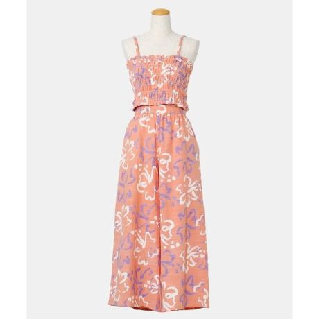 キャミソールとパンツのセットアイテム。ざっくりとした風合いの綿素材の生地に、レトロ感のあるプリントが華やかなデザイン。キャミソールの肩紐は取り外し可能なので、ベアトップとしても着用可能。Tシャツやタンクトップとの重ね着もおすすめです。