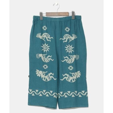 日本のステテコと世界各国の柄を融合したハーフパンツ。涼やかで肌触りの良いインド綿を使用し、さらっと快適に過ごせる一枚。両脇と後ろには便利なポケット付き。裾にタブが付いており、ロールアップすることでサイズの調整もできる。ユニセックスで楽しめる。