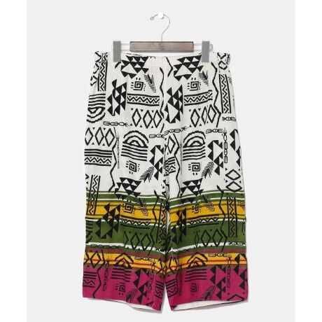 日本のステテコと世界各国の柄を融合したハーフパンツ。涼やかで肌触りの良いインド綿を使用し、さらっと快適に過ごせる一枚。両脇と後ろには便利なポケット付き。裾にタブが付いており、ロールアップすることでサイズの調整もできる。ユニセックスで楽しめる。