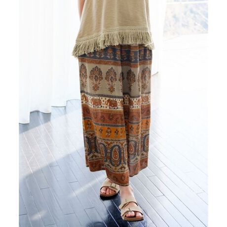 [型番:IDS-5203-2025]肌触りがよく、さらっとしたレーヨン素材のワイドパンツ。インドの日常着サリー生地からテキスタイルをデザイン。エスニックな柄とアースカラーでまとめた色展開は、エスニックスタイルだけに留まらず、いつものコーディネートのアクセントにもなる。持ち運びにも場所を取らないので、旅先で活躍する万能アイテム。