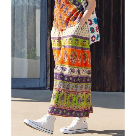 肌触りがよく、さらっとしたレーヨン素材のワイドパンツ。インドの日常着サリー生地からテキスタイルをデザイン。エスニックな柄とアースカラーでまとめた色展開は、エスニックスタイルだけに留まらず、いつものコーディネートのアクセントにもなる。持ち運びにも場所を取らないので、旅先で活躍する万能アイテム。