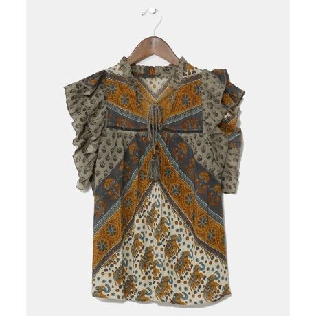 [型番:IDS-5201-2025]肌触りのよいクレープ素材で、涼しく過ごせるトップス。インドの日常着サリー生地からテキスタイルをデザイン。エスニックな柄とアースカラーでまとめた色展開は、エスニックスタイルだけに留まらず、普段のコーディネートのアクセントにもなる。