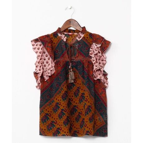 [型番:IDS-5201-2025]肌触りのよいクレープ素材で、涼しく過ごせるトップス。インドの日常着サリー生地からテキスタイルをデザイン。エスニックな柄とアースカラーでまとめた色展開は、エスニックスタイルだけに留まらず、普段のコーディネートのアクセントにもなる。