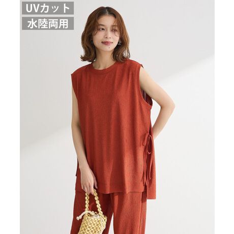 サイドリボンがフェミニンムードを引き立てるノースリーブチュニック。UVカット加工&吸水速乾の生地で仕立て、タウンユースからウォーターサイドまであらゆるシーンで活躍します。ゆったりとしたボックスシルエットで快適な着心地も魅力的。前後差のあるヘムラインがスタイリングをすっきりとまとめてくれるおすすめのアイテムです。