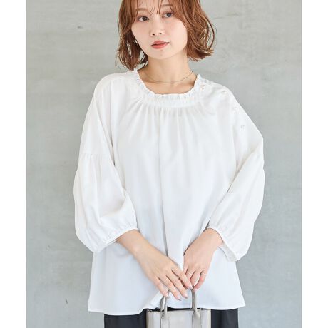 肩にあしらったパールボタンが華やかさをプラスするギャザーブラウス。