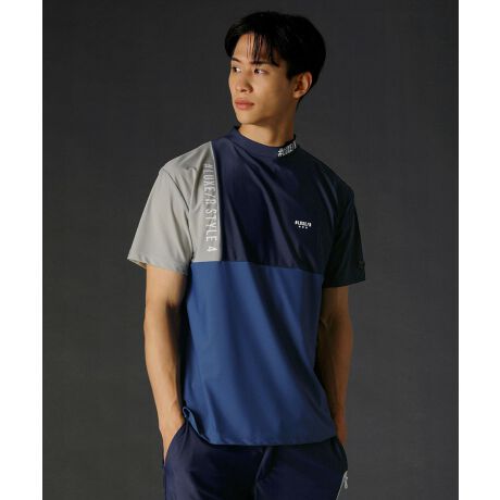 いたるところにロゴや英字プリント、ラバーワッペンを配し、どの角度から見ても目を引くデザインに仕上げました。右サイドに施した蛍光グリーンのブランドピスネームが遊び心をプラス。首元はゴルフ場でのドレスコードにも適しているハイネックデザインを採用しました。また、高いストレッチ性のある素材なので大きなスウィングもスムーズに行えるのがポイントです。