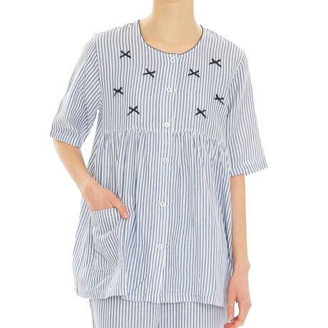 細めのストライプ柄が爽やかな印象の半袖・前開きパジャマ。