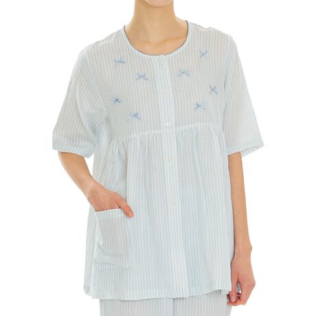 細めのストライプ柄が爽やかな印象の半袖・前開きパジャマ。