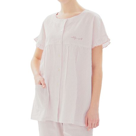 胸元にはふんわりとギャザーを寄せて、バストラインを優しく包み込み、ゆとりのある着心地に。