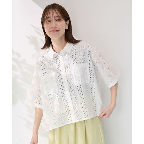 ・繊細な刺繍生地を贅沢に使ったシャツブラウス・さりげない透け感がポイント・ゆったりとしたシルエットとサイドのスリットで、抜け感も演出できる・一枚で主役になるデザイン性も嬉しいポイント