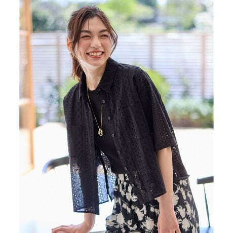 ・繊細な刺繍生地を贅沢に使ったシャツブラウス・さりげない透け感がポイント・ゆったりとしたシルエットとサイドのスリットで、抜け感も演出できる・一枚で主役になるデザイン性も嬉しいポイント