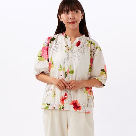 コットンローンルシオール加工ブラーフラワープリントスキッパーブラウス