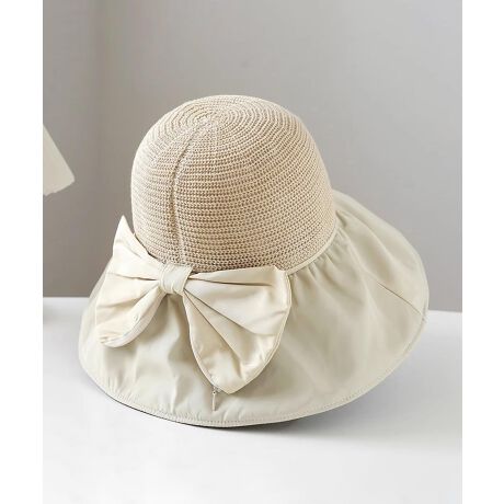 帽子のクラウン部分はやわらかく丸みのあるフォルムで、頭にやさしくフィット。広めのつばが日差しをしっかりと遮りながら、顔まわりに上品な影をつくり、フェイスラインを美しく見せてくれます。後ろには立体的なリボンがあしらわれており、さりげないアクセントを加えてくれます。