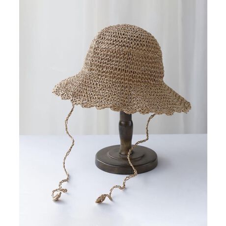 つばはウェーブラインになっており、顔まわりをふんわりと包み込むようなデザイン。全体は手編み調のルーズな仕上がりで、涼しげで柔らかな印象。あご紐付きで風のある日にも安心して着用でき、機能性にも優れています。