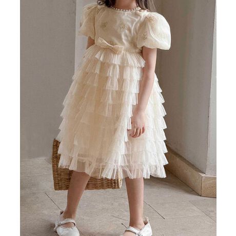 ふんわりとしたパフスリーブと繊細なフリルが重なるスカートが特徴のエレガントなワンピース。ナチュラルなカラーと優雅なシルエットが、上品でフェミニンな雰囲気。軽やかな素材で、動くたびに優雅に揺れ、プリンセスのよう。お出かけや特別なイベントにぴったりの一枚です。