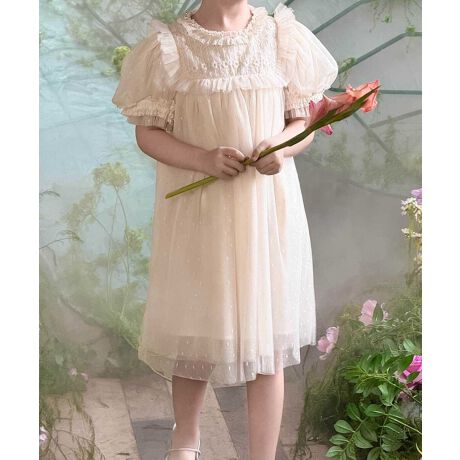 繊細なレースとふんわりとしたチュールがロマンティックなワンピース。透明感のあるパフスリーブが優雅なアクセントになり、夢幻的なスタイル。動くたびに軽やかに揺れるシルエットが、まるで妖精のような可憐な印象を与えます。特別な日のおめかしにぴったりの一着。