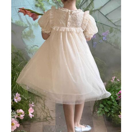 繊細なレースとふんわりとしたチュールがロマンティックなワンピース。透明感のあるパフスリーブが優雅なアクセントになり、夢幻的なスタイル。動くたびに軽やかに揺れるシルエットが、まるで妖精のような可憐な印象を与えます。特別な日のおめかしにぴったりの一着。