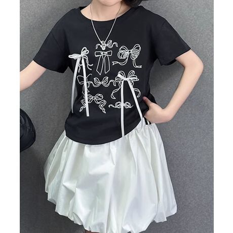 シンプルな中にも遊び心をプラスした、リボン付きプリントTシャツ。フロントにはガーリーなリボン柄をプリントし、その一部に本物のリボンを立体的に施しています。