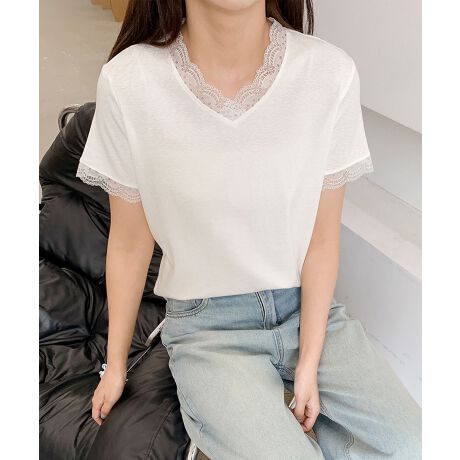 首元と袖口にレースをあしらった、フェミニンな雰囲気のVネックTシャツ。ベーシックな中に女性らしさが光る、大人のための一枚です。特に、ブラックとホワイトでレースの模様が異なり、それぞれ違った表情を楽しめます。