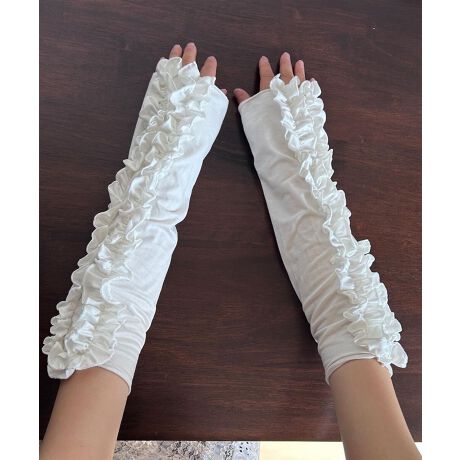 華やかなフリルが贅沢にあしらわれた、ロマンティックな雰囲気漂うロングアームカバー。日差し対策をしながら、コーディネートに可憐なアクセントを加えてくれるアイテムです。
