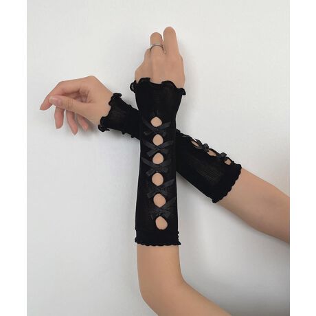 大胆なカットアウトデザインにリボンを組み合わせた、視線を引き寄せるガーリースタイルのアームカバー。装いに華やかさと個性を添えてくれるアイキャッチなアイテムです。