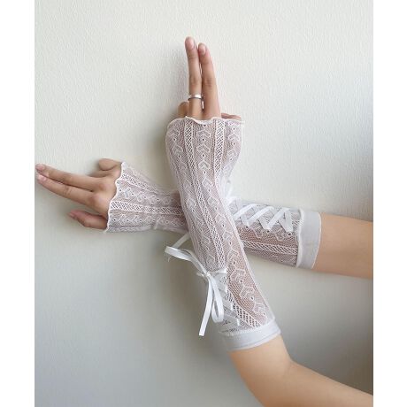 繊細なレースにリボンの編み上げをプラスした、クラシカルな魅力漂うアームカバー。手元に優雅で品のある印象を与え、特別感のあるスタイリングを叶えてくれます。