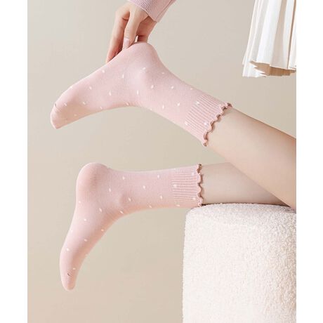 ガーリーなドット柄が可愛いソックス。袖口にコントラストカラーのデザインが施されています。カラーによってドットの配色も異なりお気に入りの1着をお選びください♪