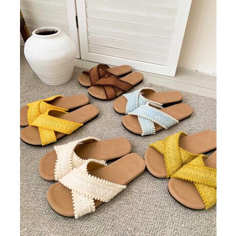 太めのクロスストラップが足にしっかりフィットし、脱ぎ履きも簡単。編み目のディテールが素朴ながらおしゃれな雰囲気を醸し出し、カジュアルスタイルにもフェミニンスタイルにもマッチします。軽やかな履き心地で、歩きやすさも◎。