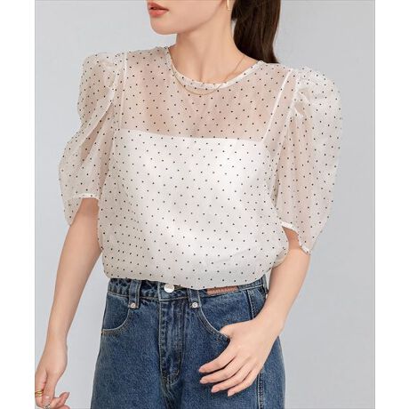 肩のギャザーとふんわりとした袖でボリュームのあるデザインに。