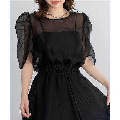 肩のギャザーとふんわりとした袖でボリュームのあるデザインに。
