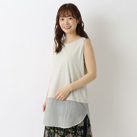 裾にシアー感のある布帛生地をドッキングした異素材タンクトップ。
