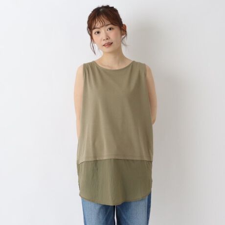 裾にシアー感のある布帛生地をドッキングした異素材タンクトップ。
