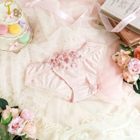 マーガレットのアーチをイメージした、ピュアで可愛らしいシリーズです。レースにはぷっくりとしたステッチでアーチのような半円のデザインをあしらい、チェック柄やスカラップのドット柄を組み合わせて、とびきりガーリーなスタイルに仕上がりました。全体に散りばめた小さなマーガレットのお花は、ウーリー糸で刺しゅうすることで、上品なフェミニンさを演出。ポイントでほどこしたラメ糸はキラキラと繊細なきらめきで、さりげない華やかさをプラスしました。