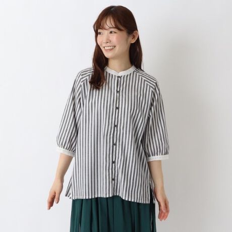 ◆コットンストライプ 5分袖ブラウス