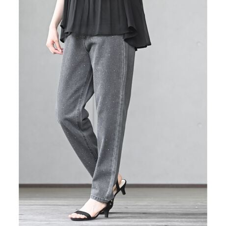 繊細なきらめきを取り入れたホットフィックスのデニムパンツ。