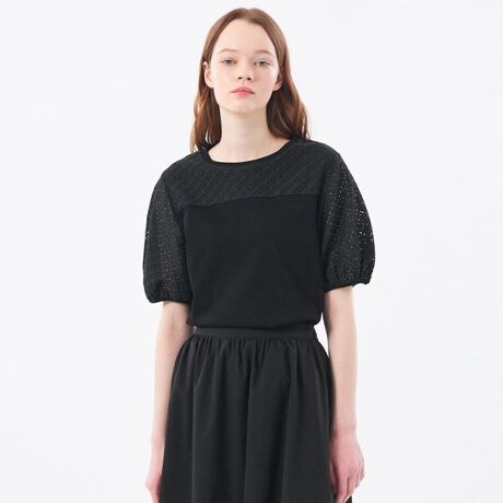 レース素材を袖と上見頃に用いたコンビカットソー。