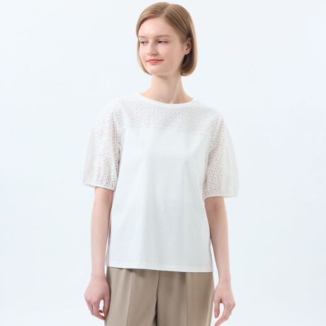 Tシャツのようにイージーな着心地と、ブラウスのように上品な印象のレース使いがポイントです。