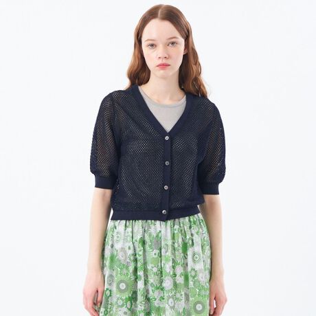 レイヤードスタイルにオススメの、透け感のあるメッシュで編立てたニットカーディガンです。