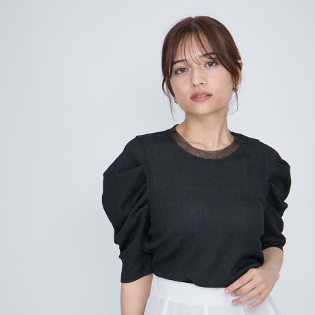 タックでつまんでボリューム感を出し、ネック部分にはシアー素材を挟み込みこんで甘いあしらいの万能トップスです。