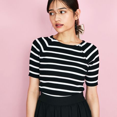 左ショルダーラインにイミテーションパールが施されたボーダーリブニットです。