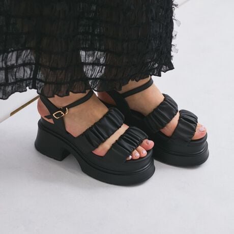 アッパー部分はシャーリングの施された幅のあるダブルストラップデザインで甘さをプラスしています。